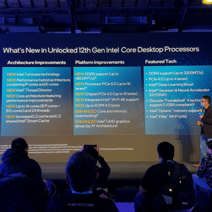 ▼ Intel 第12代處理器,在架構、平台改進以及特色科技的幾個特點,包括新的 Intel 7 製程、最高 16 核心 24 執行緒配置(8 大 8小)。另外在平台部分則是支援 DDR5 記憶體(最高 4800MT/s)、PCIe 5.0(主機板晶片組則是提升至 PCIe 4.0)等。