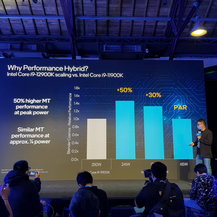 ▼ 在功率 65W 的設定下,i9-12900K 即能跟 i9-11900K 達到同樣的效能,最高 241W 的功率設定下,則能有 50% 的效能提升。