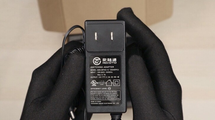 電源供應器為歐陸通的,輸出 12V⎓2A。這也是大多外接 3.5" 硬碟、U.2 磁碟無法單純用 USB 供電的原因,因為 USB 無法提供這些耗電較高的磁碟足夠的電力。