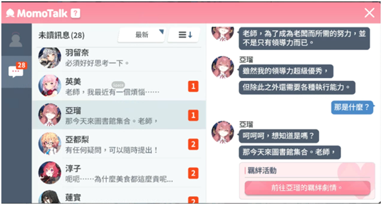 當親密度足夠後,開啟羈絆就能獲得各類的私訊對話,還有最最重要的Live2D功能,會動的學生讓人真的是心動動