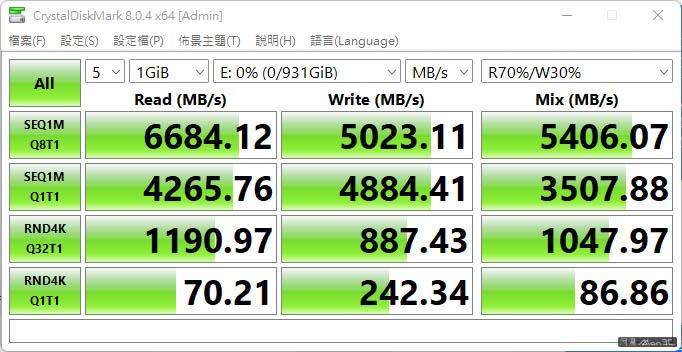 首先來個快樂的跑分 - CrystalDiskMark,讀取 6684MB/s,寫入 5023MB/s,稍高於官方標示。