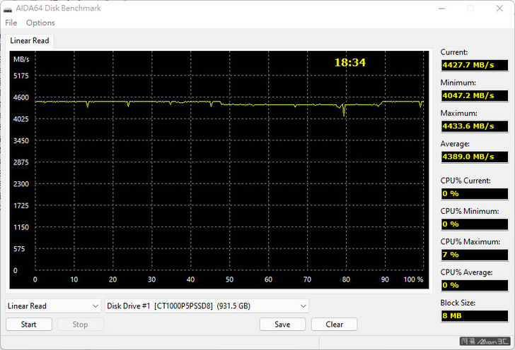 AIDA64 全碟讀取為穩定的 4436MB/s。AIDA64 全碟讀取為穩定的 4436MB/s。