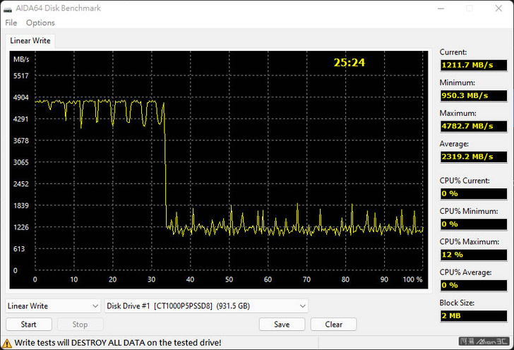 全碟寫入,起始穩定於 4700MB/s 左右,於寫入 34% 區域後降至 1000MB/s 左右,估計此時用盡 SLC 快取。