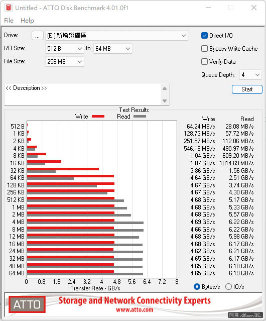 ATTO Disk Benchmark 成績如下,在各種檔案大小下都能有一致的速度。