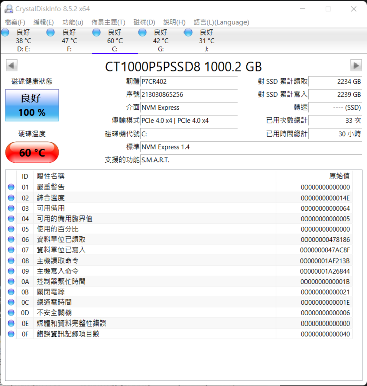 然而有一點須注意,就是從 CrystalDiskInfo 來看,美光 P5 Plus 溫度是有些偏高的。