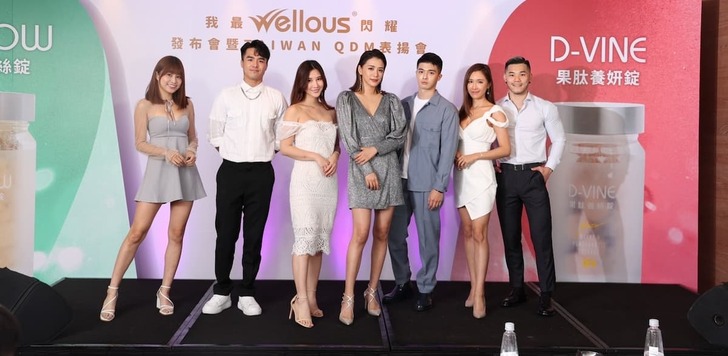 「Wellous我最閃耀」D-VINE、S-GLOW新品發布會(由左至右:陳伊、Neil、Patty、王思平、Orlando、Chelsea、Ezza)。