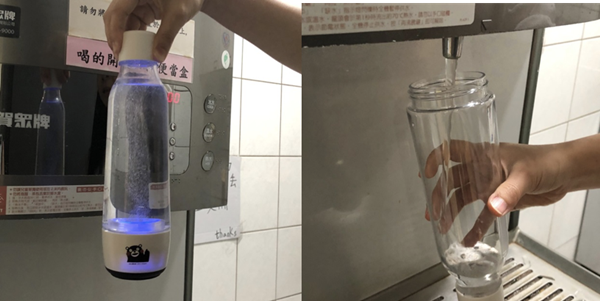 操作也很簡單,我在公司直接裝飲水機的水然後按下底部開關就能開始製成氫水,底座還有熊本熊的圖樣,真的好療癒~