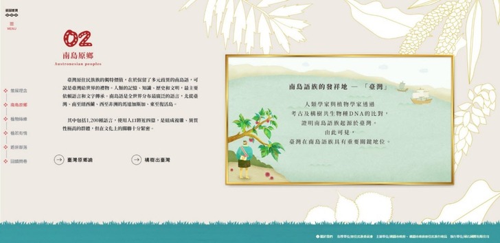 由桃園市政府原住民族行政局所規劃的「太平洋的風:島嶼部落」線上展,打破實體空間的限制,規劃了『南島原鄉』、『植物絲維』、『植若有情』、『遊原部落』四大單元,運用手繪插畫風格在線上生動展出,以原住民族生活息息相關的「民族植物」作為探索的脈絡,讓民眾了解原住民族生活中的特色植物,以及各種植物所代表含意與應用,完整呈現原住民族與土地共生、共融的生活智慧。