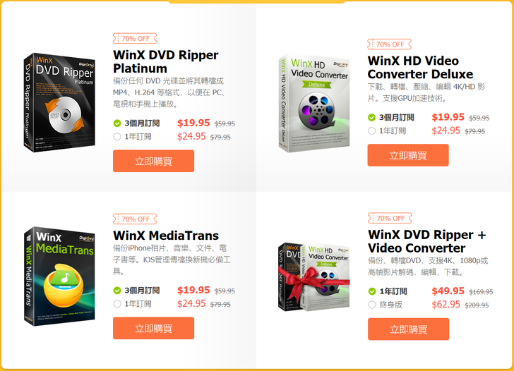 WinXDVD黑色星期五促銷,為WinX DVD Ripper Platinum,WinX HD Video Converter Deluxe,WinX MediaTrans,WinX DVD Copy Pro和多合一捆綁包,提供限時3折優惠。