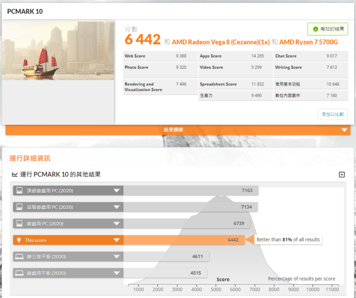 整體測試表現也快追上遊戲用 PC(2020) 的標準, 會比家中另外一台 6600K + RX560 還要來的高分許多.