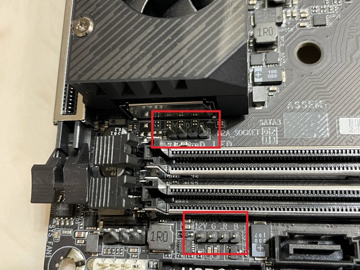 這年頭什麼都要 RGB, 當然在X570I AORUS PRO WIFI 上也能找到, ARGB與RGB接口分別坐落在記憶體插槽的上下兩側 (紅框).