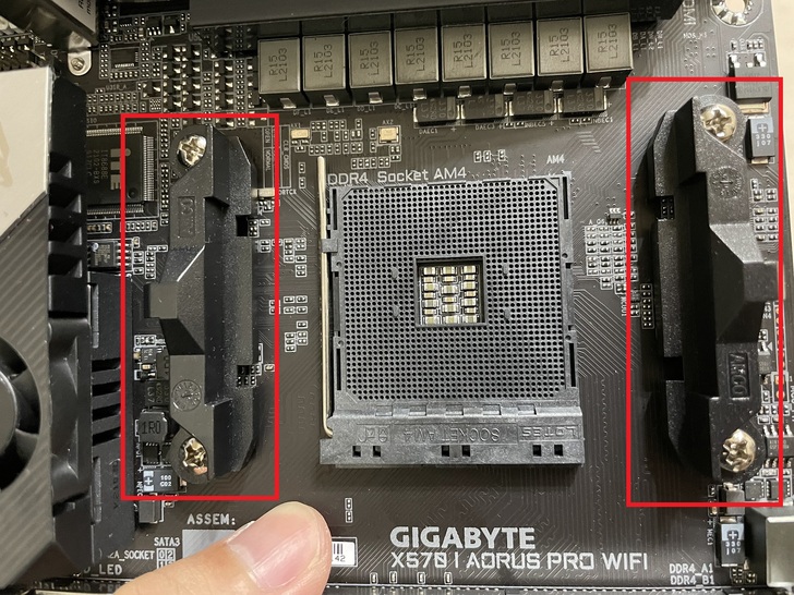 若是第一次入手的玩家朋友可能會很疑惑 5700G 裡面附的散熱器到底要如何安裝在主機板上, 因為安裝方式跟以前左右壓扣的方式不太一樣, 需要先將紅框處的這兩片取下來, 接著原廠散熱器就可以直接鎖在主機板原有的背板上了.