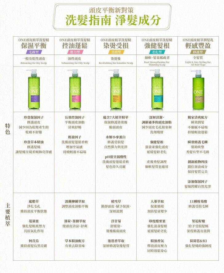 細數ONE頭皮植萃平衡系列共有四款洗髮系列+一款潤髮