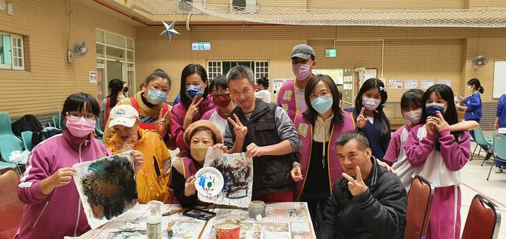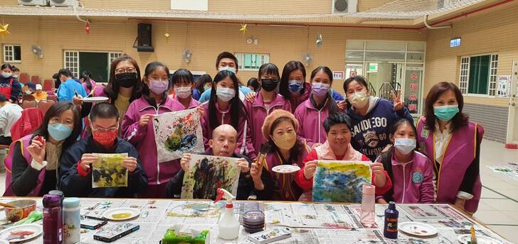 ▲圓緣會創辦人湯發鉅與理事長李玉嬋、創會理事長曹晏華帶領志工到教養院,推出老憨兒一日畫室慈善活動。 (圖/圓緣慈善推廣協會提供)