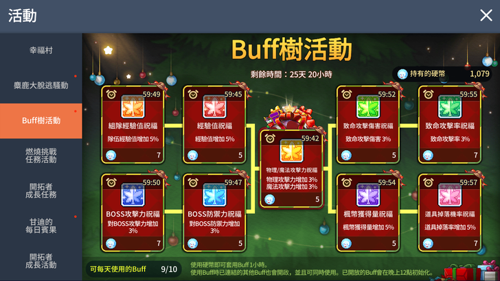 用獲得的雪人硬幣換取多種的BUFF,在一小時後獲得的祝福種類非常多,