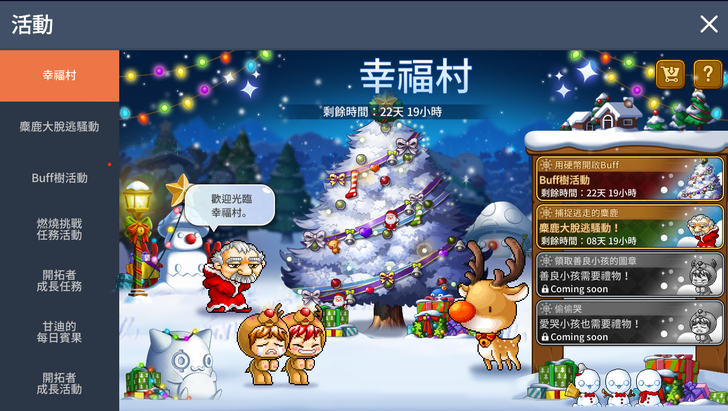 幸福村中目前已經開放的有BUFF樹活動跟麋鹿大逃脫騷動
