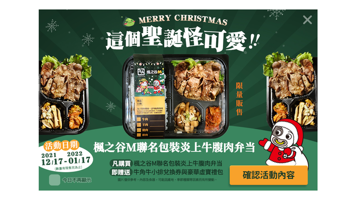 聯名餐點 菇菇炎上牛腹肉弁当,每份餐點贈送楓之谷M虛寶