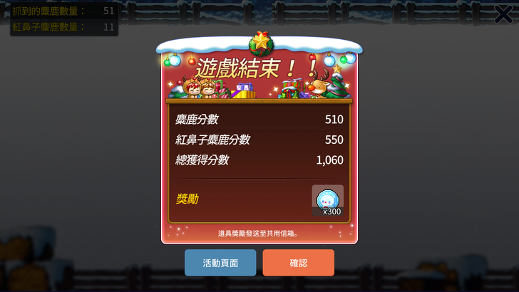 抓住逃跑的麋鹿抓到的越多獲得的雪人硬幣也越多,每場最多可獲得310個,一天可以玩3次