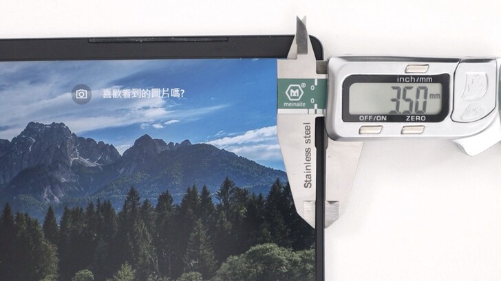 官方標示邊框僅 2mm,我們實測從邊框到面板的實際顯示區域,大約也只有 3.5mm,真的是很窄。這其實滿震撼的,因為我的文書筆電 MacBook Pro 也是 16:10,機身長寬尺寸與 XENIA 14 剛剛好差不多,一來一往差距都在一公分以內。但是 XENIA 是 14 吋的超窄邊框。