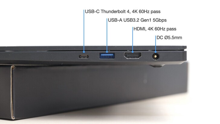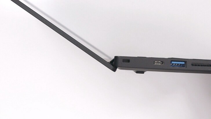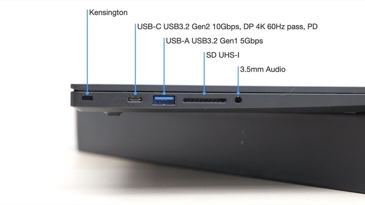 I/O 部分以輕薄筆電來說也給得很到位,左邊有一個防盜鎖,USB-C 為 USB3.2 Gen2 10Gbps,支援 DP Alt Mode,實測可以達到 4K 60Hz,並支援 65W PD 充電。USB-A 為 USB 3.2 Gen1 5Gbps。SD 卡為標準尺寸,支援 UHS-I。旁邊還有一個 3.5mm 耳機麥克風接孔。