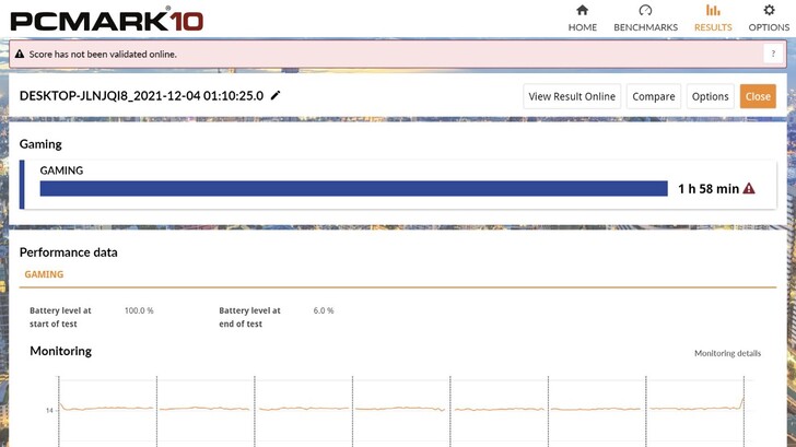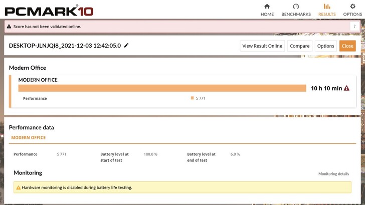 續航力方面,Office Mode 下測試 PCMark10 Modern Office 可以達到 10 小時。以輕薄筆電來說,他的電池容量不算大,所以續航力無法非常久,但也有個基礎以上。我會比較推薦給 A、B 定點跑的使用者,家裡跟公司各放一顆充電器,續航力絕對可以滿足中間通勤的使用時間。