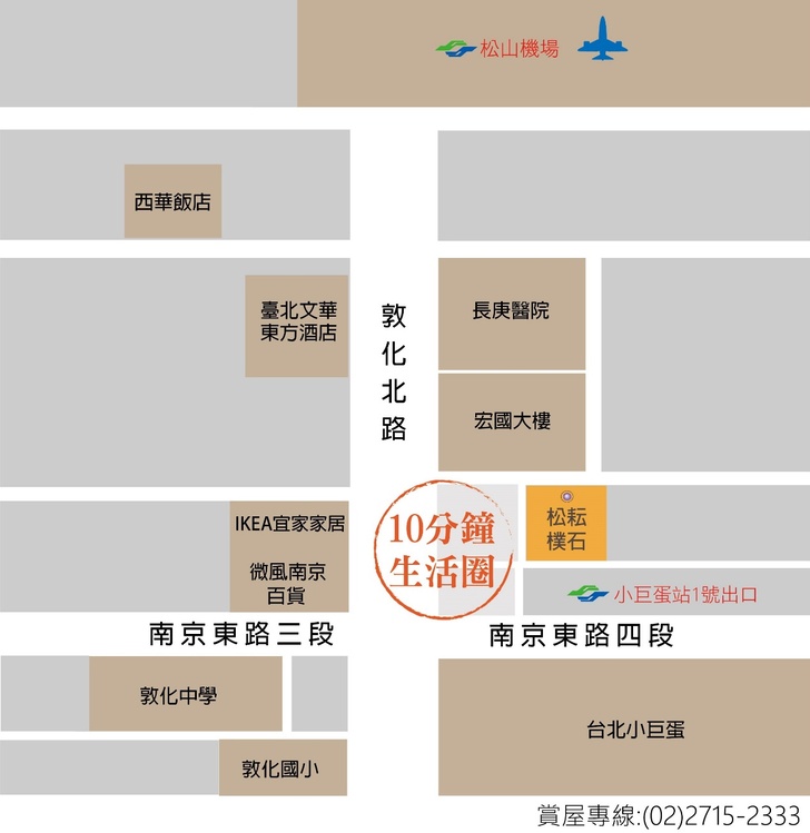 在寸土寸金的敦化北路上,許多企業總部及飯店皆設立於此,包含中華開發金控大樓、宏國大樓、東方文華飯店等知名企業,搶佔敦北林蔭大道的原因,除了鄰近松山機場,在聯外航班上,以亞洲為主,國內航班居多,便於商務往來,方便海歸族出入國門;亦有影視及運動重心-台北小巨蛋,不時舉辦大型展演活動,更佔據敦化北路一隅。除了微風南京插旗敦北,更有許多各國料理入住小巨蛋商圈,無論在食衣住行上,極為成熟之育樂生活圈。因此不少人都在敦化北路一帶購置房產、租賃企業總部,敦北門牌除了保值,更為未來的事業版圖,打造新據點。