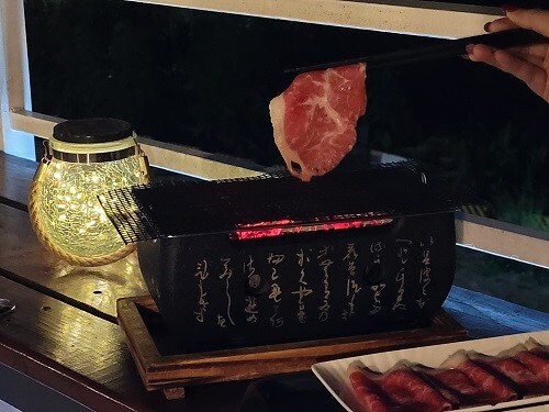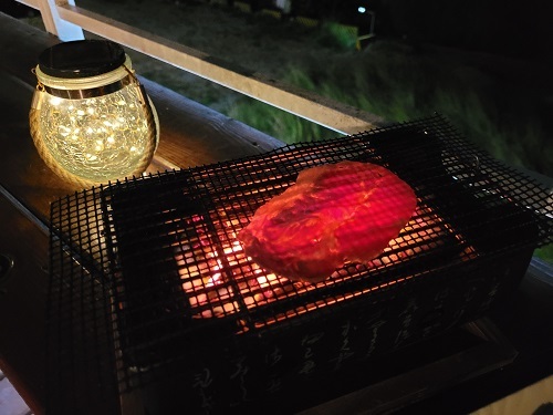 在火光下通紅的肉片,隨著火烤飄出陣陣炭香,