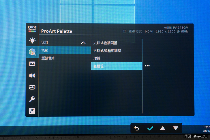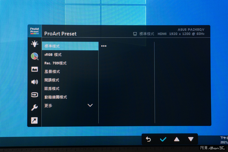 OSD 部分,再顯色模式上提供了相當多的選擇,尤其在 ProArt 系列上,又提供了幾個標準色域模式,如 Rec. 709。
