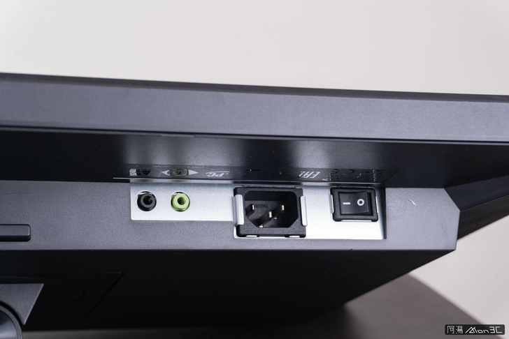底部 I/O 部分,右側有著電源、獨立於正面的 AC 電源開關以及麥克風與耳機接孔。