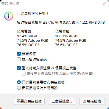 那麼看一下實際的色域表現,DCI-P3 色域覆蓋 76.5%。