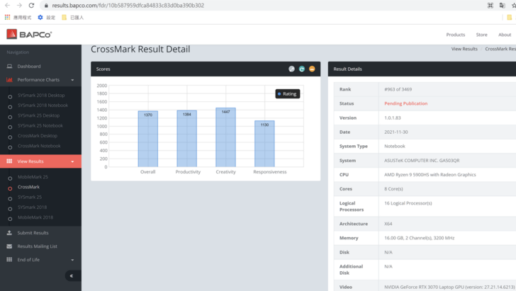 朋友也用他的AMD R9 5900HS、RTX 3070 Laptop、2K解析度筆電分享測試結果,