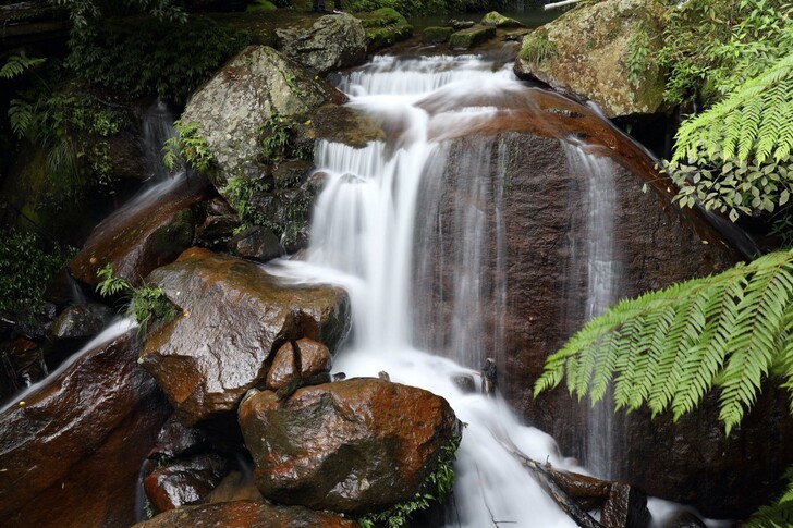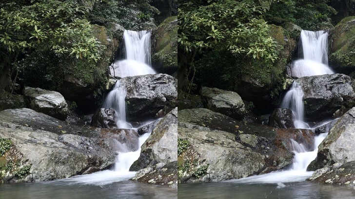 這兩張拍攝的參數都一樣,也都有使用 STC CPL Filter,只是藉由轉動 CPL Filter 到不同角度就可以看到反光效果的不同。如右圖可以看到濕潤石頭上的水灘、葉子、水流的反光都減少了,讓畫面主體瀑布更突出。