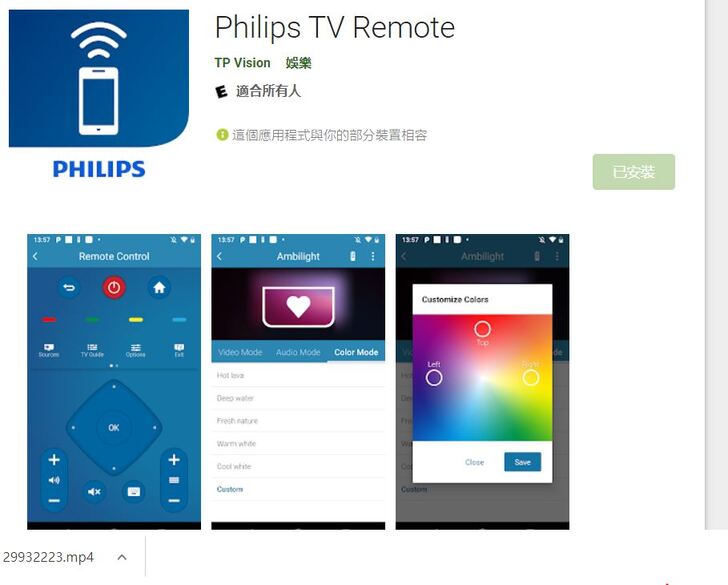 只要手機下載 "Philips TV remote "就能輕易將行動裝置當成遙控器使用