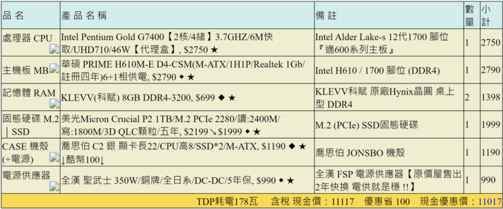 主機板由於4650G綁金士頓DDR4 3200 8G,所以另一條也搭配同品牌與規格,只是個快速估價單參考,實際上依每個人喜好挑選或想購買的實體店面或網購為主。