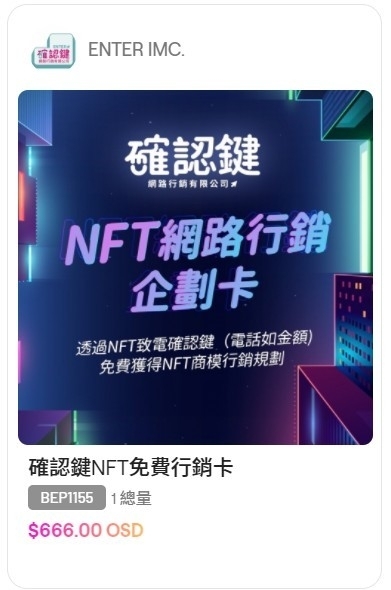 除了賀卡項目,也同時上架了公司永久性VIP會員卡,正式踏入NFT市場,並表示想廣邀有良好NFT商模的團隊可以主動的來聯繫確認鍵,此動作正推動了行銷業界進一步與各產業業者產生連結並共同打造進入高競爭又新穎的NFT市場,實現虛擬世界多元化且探索其發展性的可能。同時也表示在這段期間持NFT卡截圖的夥伴都將提供免費一套行銷規劃方案(限量10組),十足踩定了虛實整合服務的藍圖。