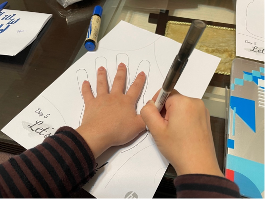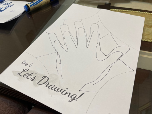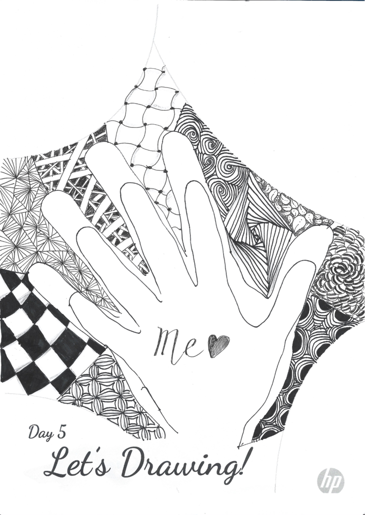 第五天的挑戰,在中央畫上手,然後周圍畫禪繞畫.大家都知道不要挑戰我美術天份,因為我沒有這種天份……還好我有神秘小幫手協助我,畫出來的成品出乎我意料的好看