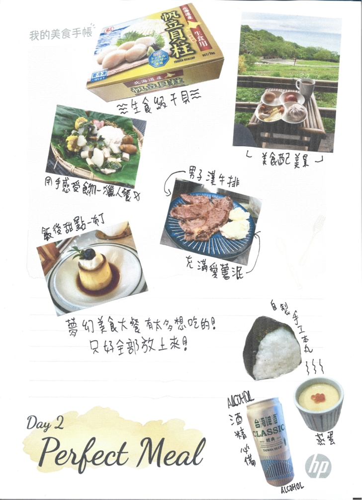 第二天的挑戰要放我想像中的美食,在製作的過程中也好好的利用印表機將美食的照片印出來,然後剪下來再把它貼成我的美食日記,上面的食物其實有很多是跟神秘人物一起吃的喔!!