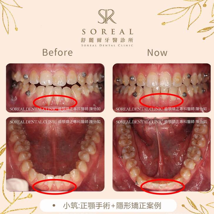 經過正顎手術及一年多隱適美配戴調整下顎門牙角度後,
