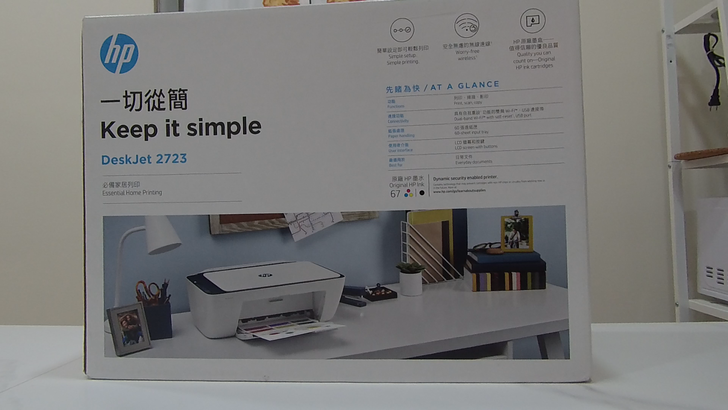 HP DeskJet 2723 All-in-One 印表機的外表是簡約有質感的白色搭配深藍色,產品外盒主打的關鍵字是「一切從簡 Keep it simple」,由此可知這是一台極簡單設定、容易使用的機型。