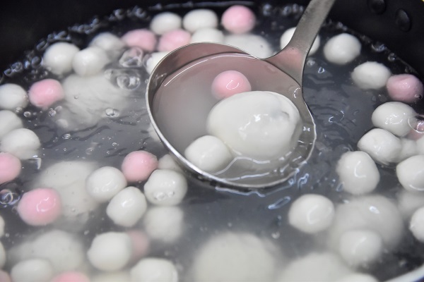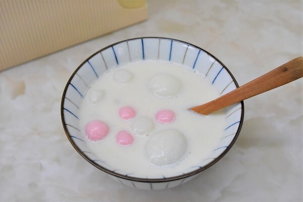 先把元宵下鍋煮熟,杏仁粉加適量的熱水泡開,把煮好的元宵撈起來放進泡好的杏仁奶裡,就大功告成了