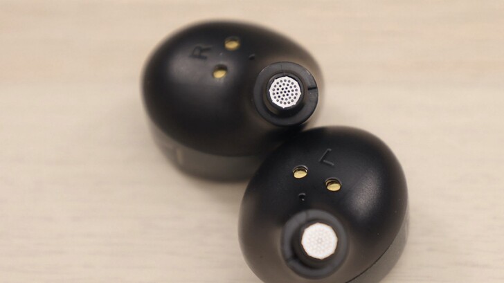 左右兩邊耳機上都有 R、L 的左右標示方便辨認,但外型實在太像,導致我用到現在經常還是會在充電倉放錯格。耳機上也有兩個金屬接觸點讓充電倉為其充電。