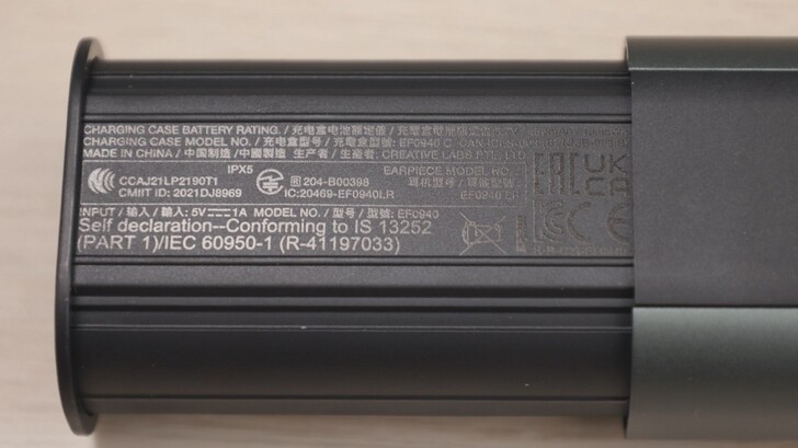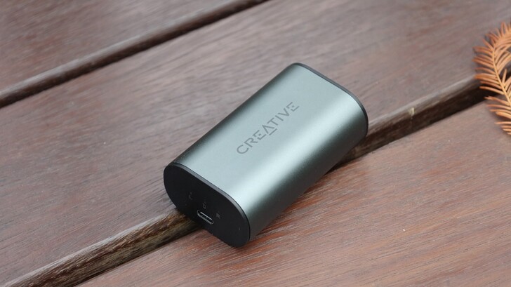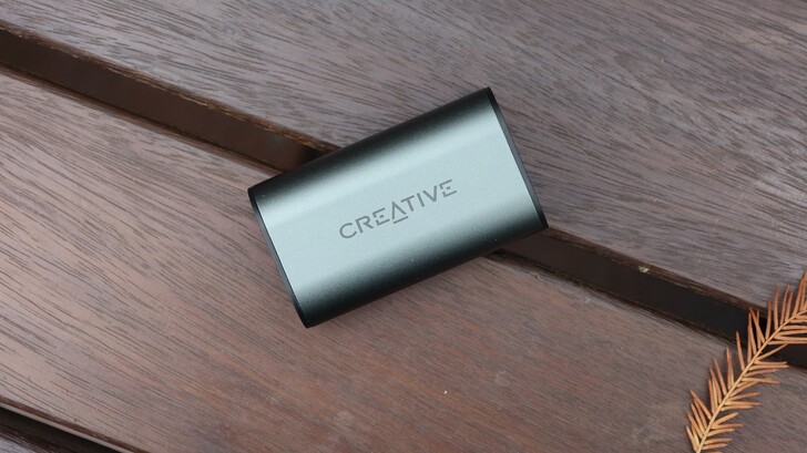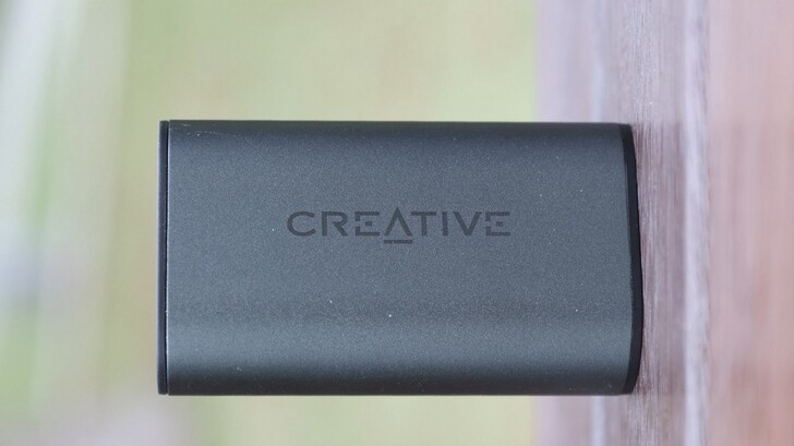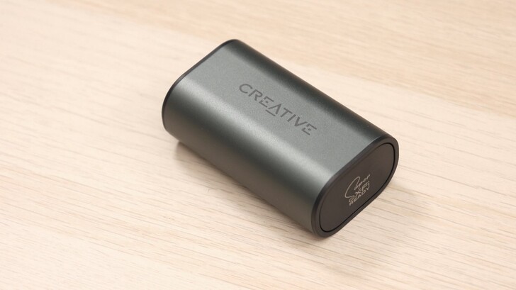 充電倉外殼以金屬包覆,表面有深墨綠色的陽極處理,算是耐髒好清潔。正面雷射印著 Creative Logo,相當俐落。