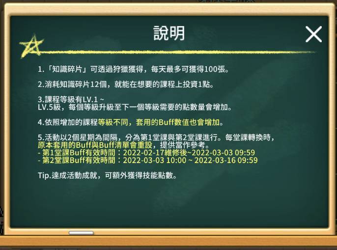 上課需要的不是課本,而是要通過狩獵取得知識碎片,一天可以獲得的碎片上限是100個(是說取得的碎片不會出現在背包裡,會直接顯示在活動頁面,我第一天上課的時候還想說怎麼都不會掉,進入活動頁面才發現早就100了)透過知識碎片來進行課程,每12個碎片可以提升1點課程點數,越高的等級則需要越多的課程點數才能提升,藉由提升課程等級可以取得不同課程的Buff效果