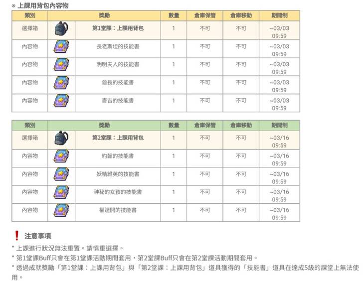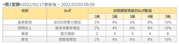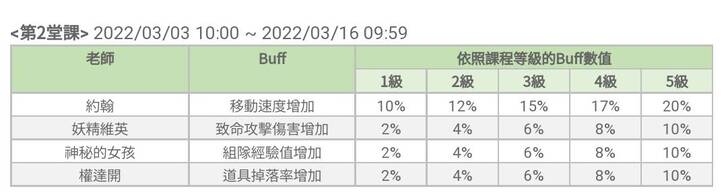 可惜的是這個Buff效果只有在課程活動期間才能套用,而且第1堂課Buff只能在其活動期間套用,同理第2堂課Buff也是只在第2堂課活動期間才可以套用(算是15天左右的一個小小Buff概念)