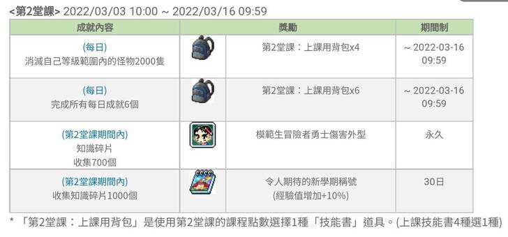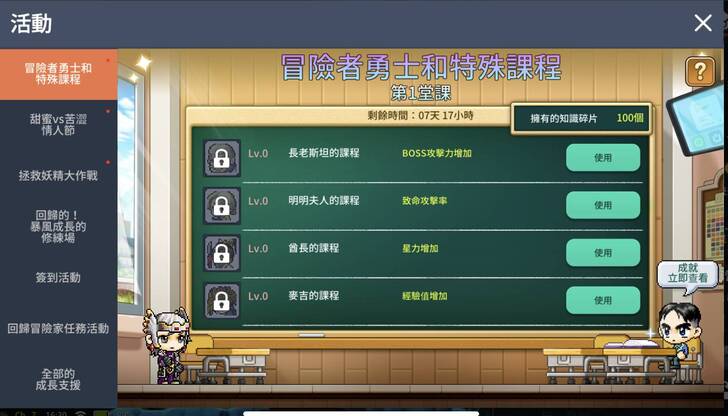 當然長達一個月的活動還有其他的成就獎勵可以拿,像我這種最討厭有時間限制獎勵的人,看到“永久”兩個字眼睛才會亮起來,才會有動力想要去花時間解任務!這活動唯二的活動獎勵分別是<搭檔冒險者勇士椅子>和<模範生冒險者勇士傷害外型>,而且它們取得條件也相同,只要在第一堂課和第二堂課期間內各收集700個知識碎片就可以拿到了,也就是出席率超過50趴就可以了(感覺可以翹課蠻多天,老師還滿佛心來著~)