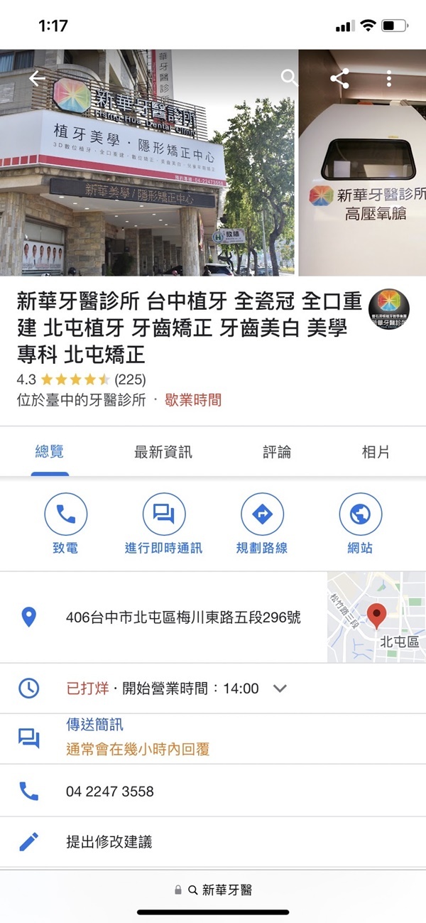 回到台中時其實也不抱有太大期望,但爬了兩三天的文發現大家都很推在北屯新華牙醫,尤其朱裕華醫師是植牙權威,幫助過很多植牙失敗患者解決很多植牙問題,看一下Google評論和分數也蠻高的,馬上透過官方line@線上預約,不得不說可以線上預約看牙還蠻方便,回覆也很快速。
