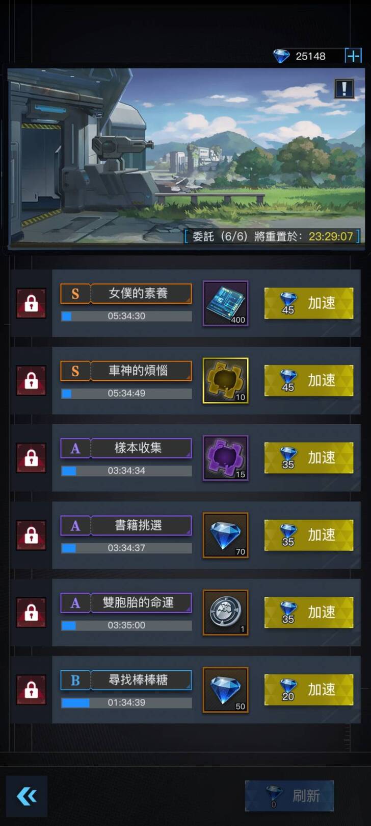 每天六個委託,派出相對應的戰姬然後取得獎勵,如果遇到不喜歡的委託還可以花少量鑽石直到換到想要的委託,是獲得想要的資源的好地方