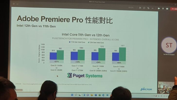 在Adobe Premiere Pro的性能對比上,Intel 12th Gen vs Intel 11th Gen,在i5、i7、i9(DDR4與DDR5兩種),分別都有21%、18%、34%、46%的成長幅度,明顯可以看到DDR5的成長幅度有著明顯提升。