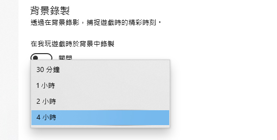 步驟2:確認下方預設的錄影時間是多長, Win 10 給的最短時間是30分鐘、最長是4個小時,但通常一般的錄製使用按照它原本預設的2小時錄製就足夠,除非是玩那種沒有時間限制的遊戲才需要將時間拉到4小時。