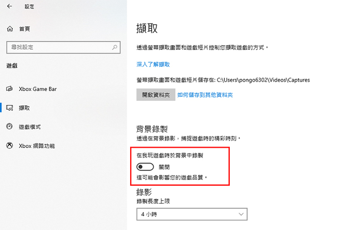 步驟1:到桌面開始的設定裡找到遊戲選項的擷取,確認背景錄影是否開啟。一般情況下,背景錄影多少會影響到電腦的效能,所以在不需要錄影的情況下,可以習慣性將其關閉。